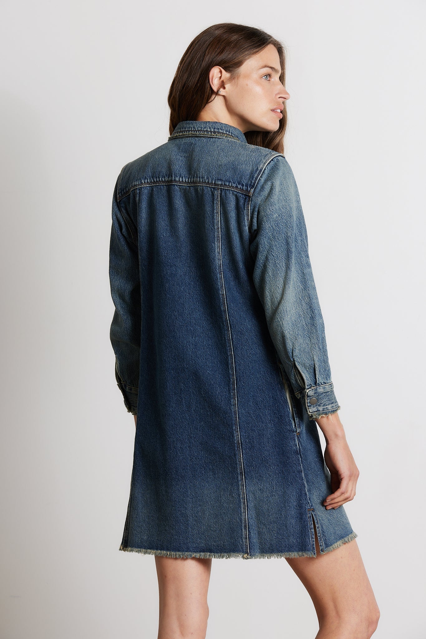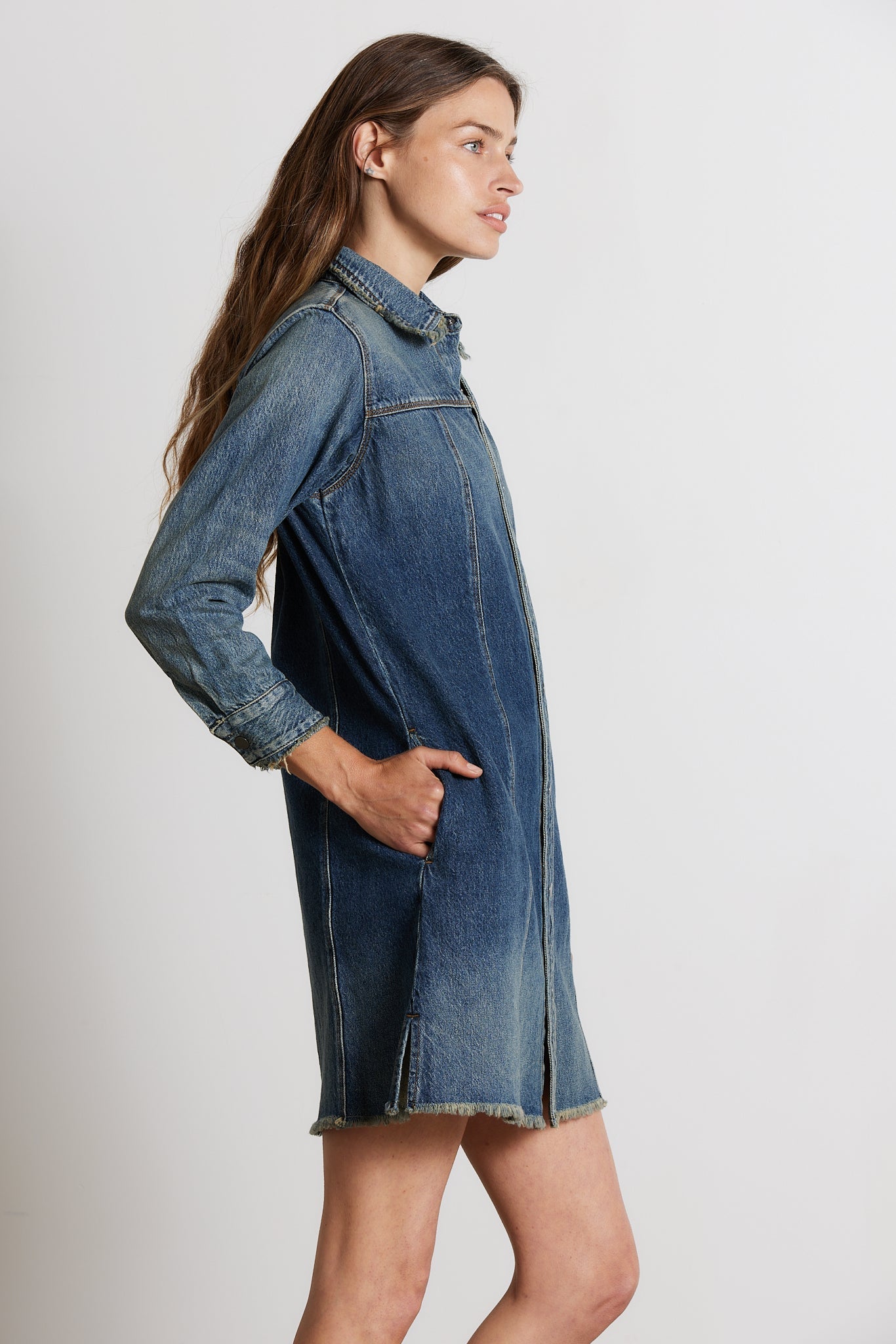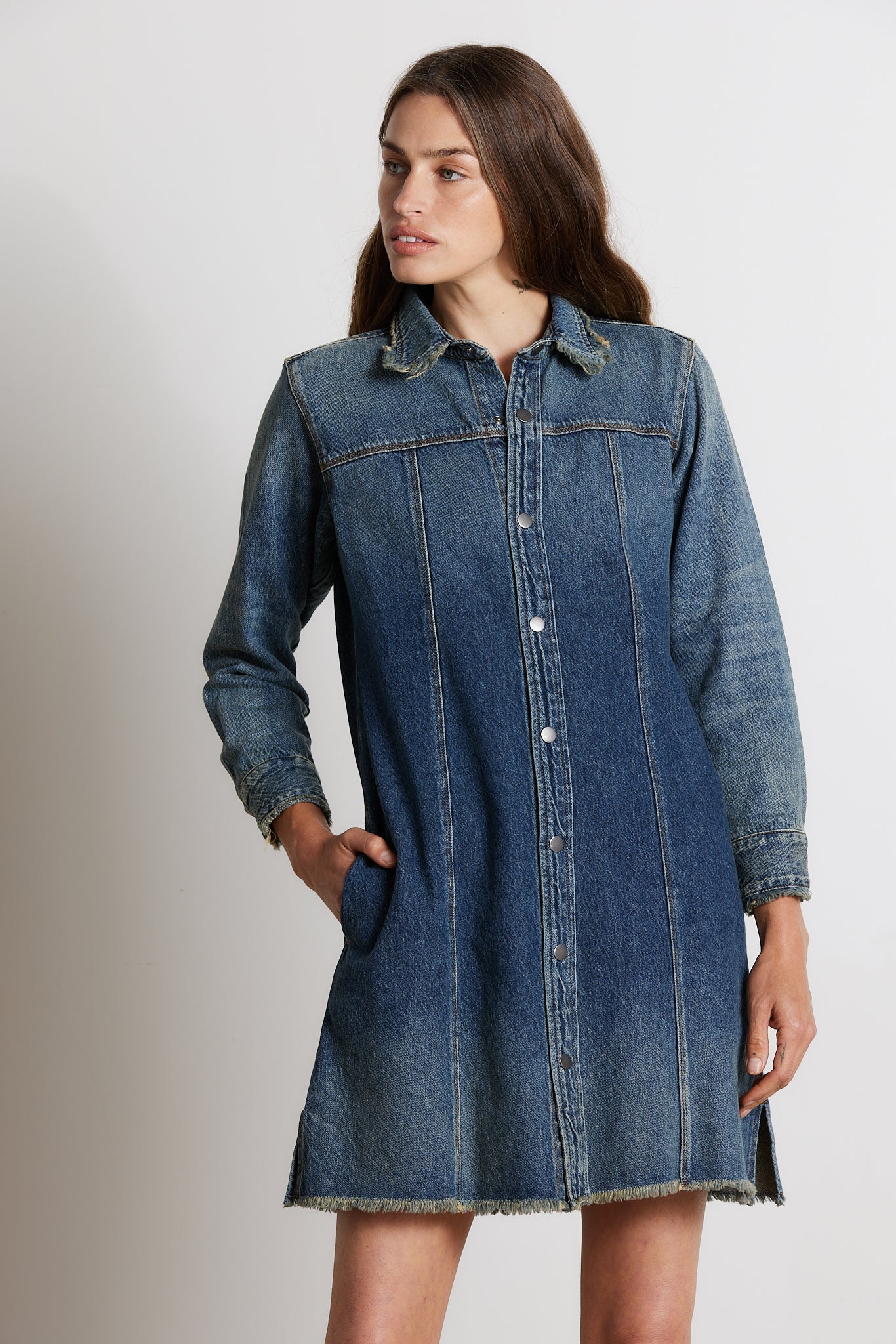 - Elongated shirt dress in a soft medium weight denim. Has a slightly ruffled collar, snap front closure and side pockets.